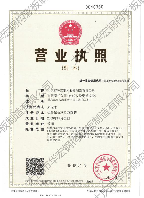 華宏鋼構始建于2009年8月9日,總部位于大慶市薩爾圖區南一路13號,現有大慶市華宏鋼構彩板制造有限公司、黑龍江省華宏力安綠建科技有限公司、大慶市華宏鋼構彩板制造有限公司長春分公司、黑龍江省海森新材料科技有限公司、大慶市瑞和通螺栓廠五家工業企業形成了以彩板復合板、裝配式鋼結構建筑、保溫材料、配件制造為主的五大生產基地,占地總面積 10 萬平方米,生產車間5萬平方米。中高層管理干部26 人,高級工程師9人,各類國家注冊執業人員 32 人,車間技工 260人,專業安裝隊伍 10 余支,帶動就業 500