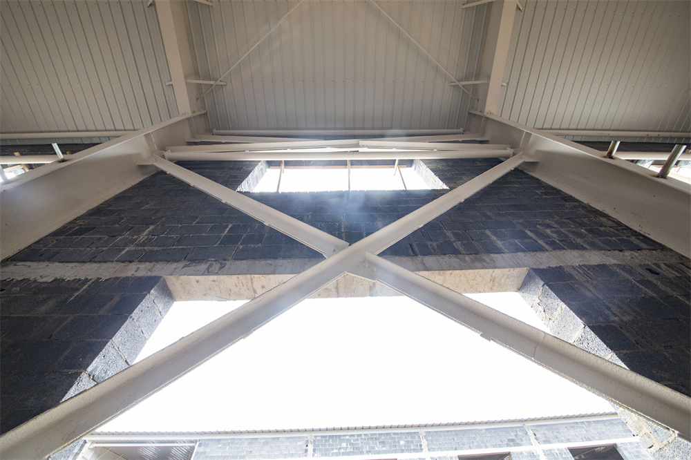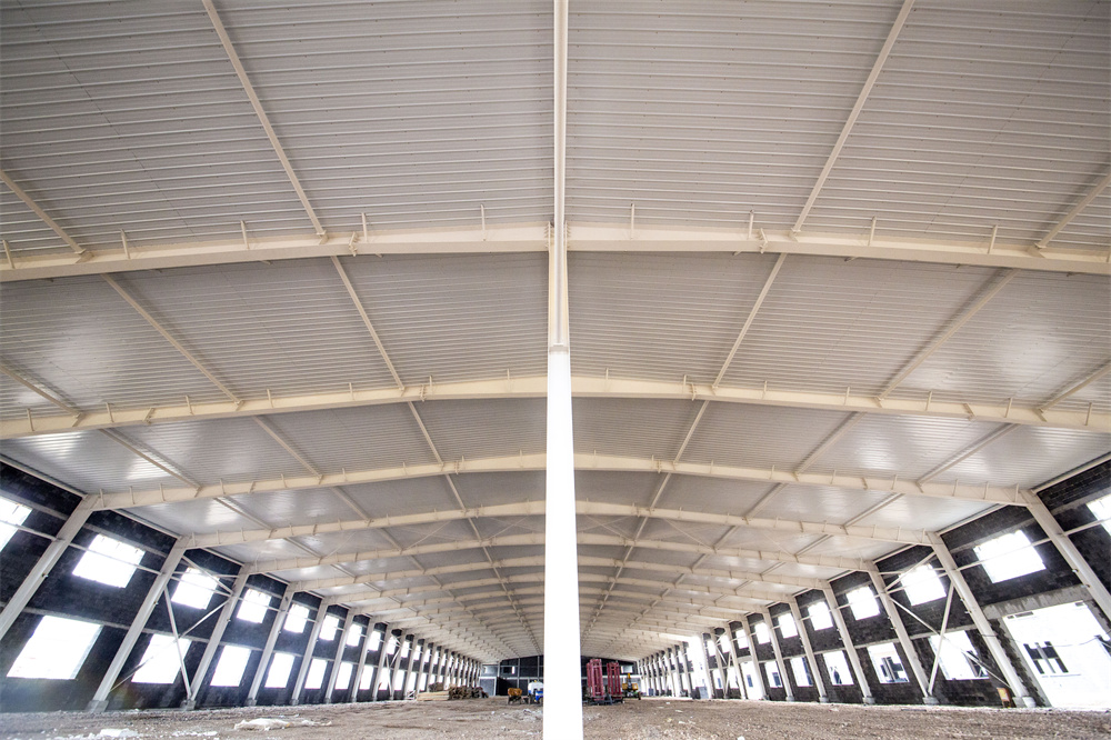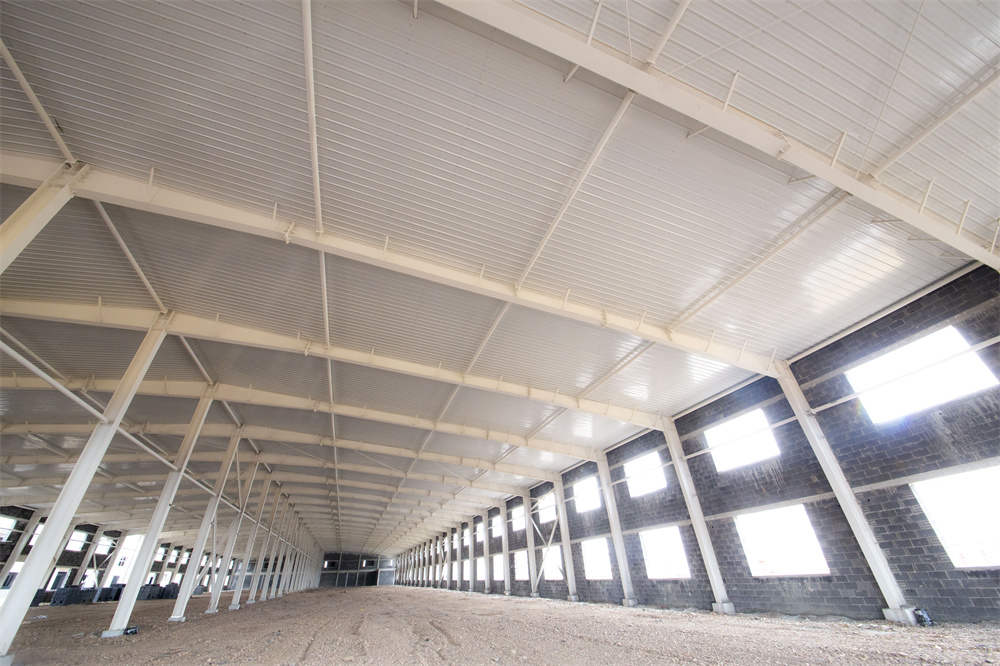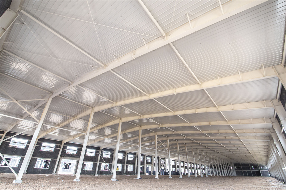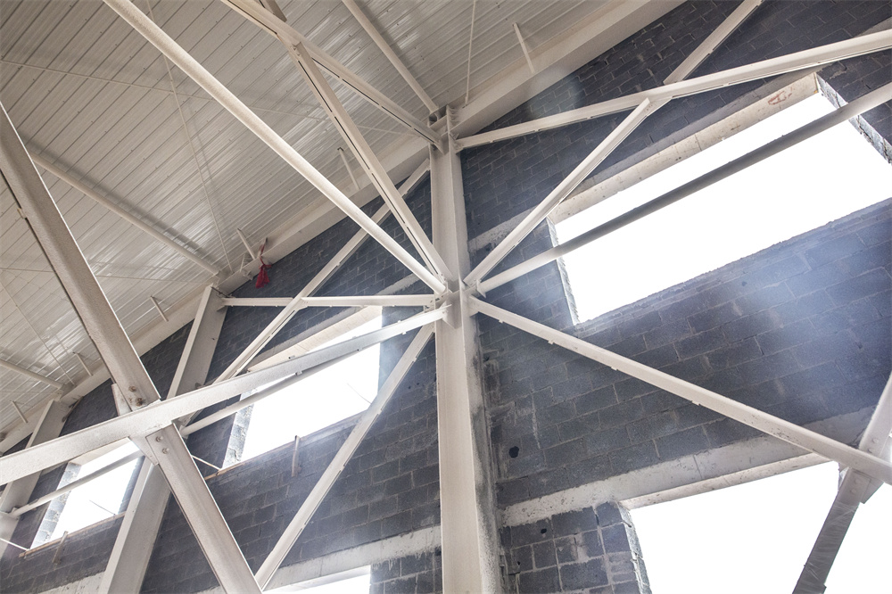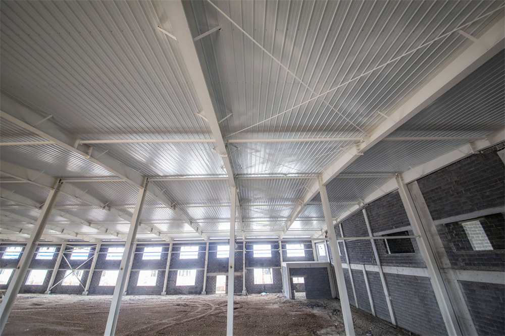 項目特點:本工程為共計兩棟單體1-廠房、2-廠房。廠房長度159.3m、寬度46m、檐口高度8.1m。局部二層為混凝土結構。室內外墻體均為土建墻體,屋面保溫為雙層75mm厚玻璃絲綿現場復合板,屋面外板為820型角馳板。室內屋面懸掛噴淋系統,土建墻體與鋼結構連接節點復雜,混凝土結構施工與鋼結構施工交叉作業,增加施工難度。