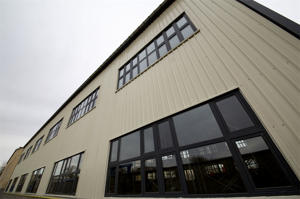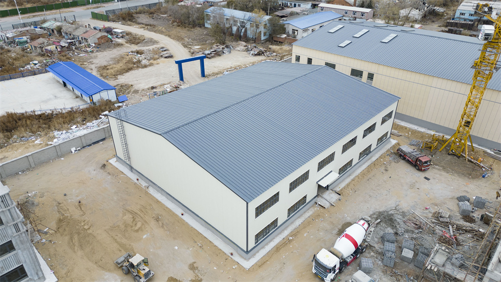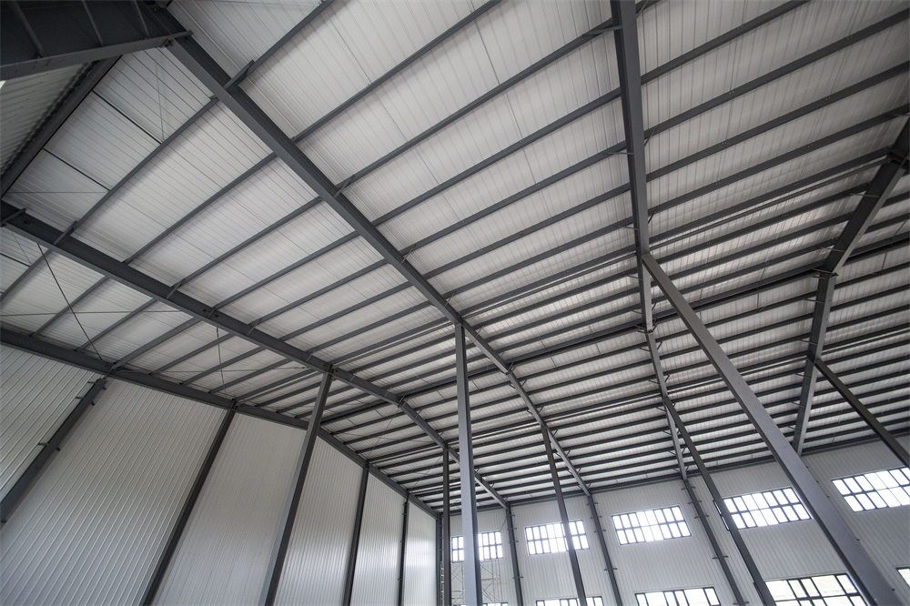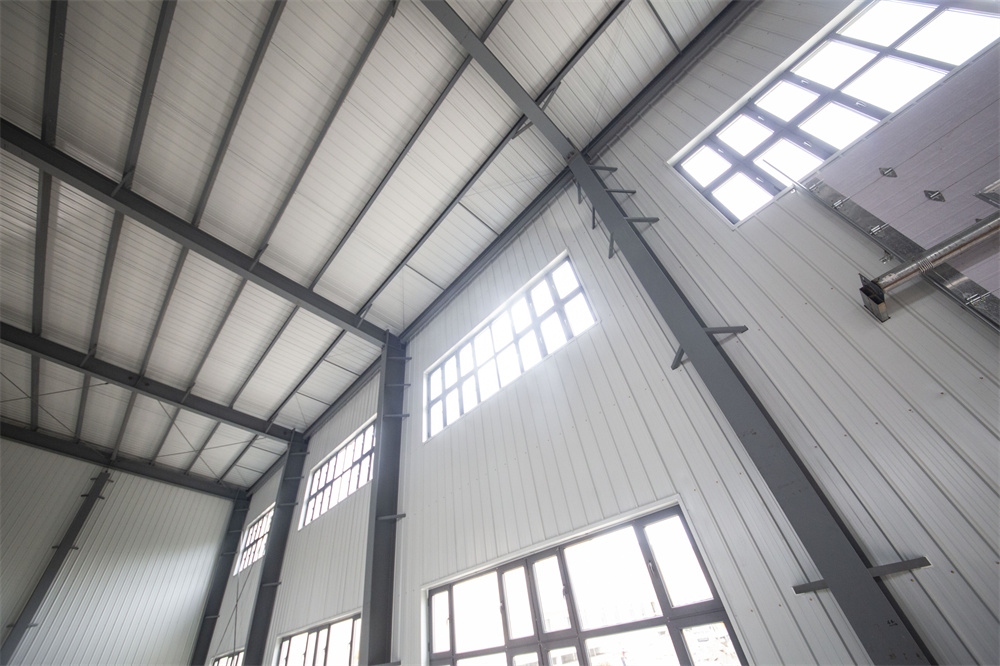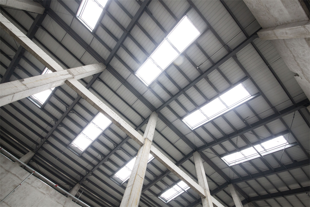 單個工程總建筑面積為:10077㎡,室外設計地面*其口與屋脊的平均高度為13.3米,墻面采用砌體結構,屋面采用輕鋼屋架結構,結構為高低跨,不規則形狀,加工構件種類多,對安裝精度要求高,屋面維護為150厚巖棉復合壓型鋼板坡屋面,設有多個采光帶,屋面單玻長,板重施工難度大,防水要求高。